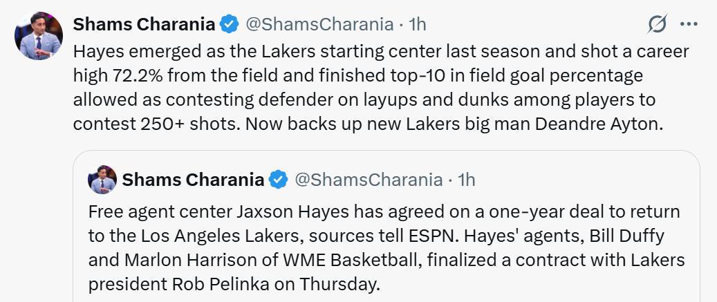 根据ESPN名记Shams报道,湖人队与内线海斯签下一份一年续约合同,后者回归紫金军团。